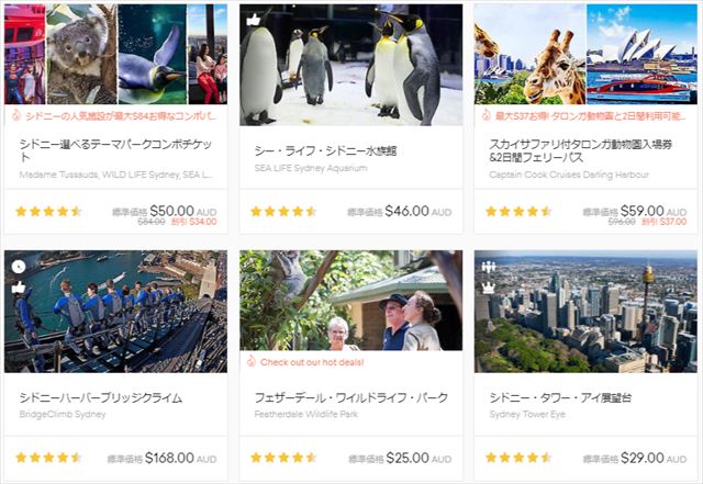 動物園、水族館、シドニータワーなどの人気アトラクションがセットで割引になったお得なコンボチケットをはじめとして、ハーバーブリッジの上を上るブリッジクライム、ジェットボート、クルーズ、周遊観光バス、ホエールウォッチング、スカイダイビング、熱気球、サーフィンから、レストランコースランチ・ディナーまで、あらゆるアクティビティーがリストされています。