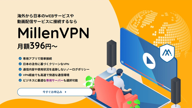 MillenVPN(ミレンVPN)は、日本語で使える日本発のVPNサービスです。海外から日本のVOD(動画配信)やWebサービスにアクセスしたい人、旅行・出張中に安全な通信を確保したい人に向いています。