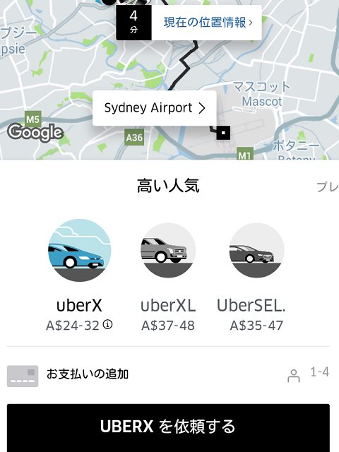 この例では4人乗りの標準車種である「uberX」を選択しています。